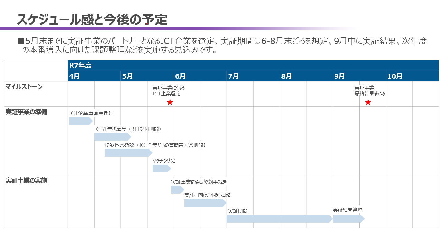 - 実証事業内容及び成果を踏まえて、令和8年度に本番導入(別途調達)を想定しています。なお、本番導入では実証事業の類似業務も含めて、事業化を検討しています。