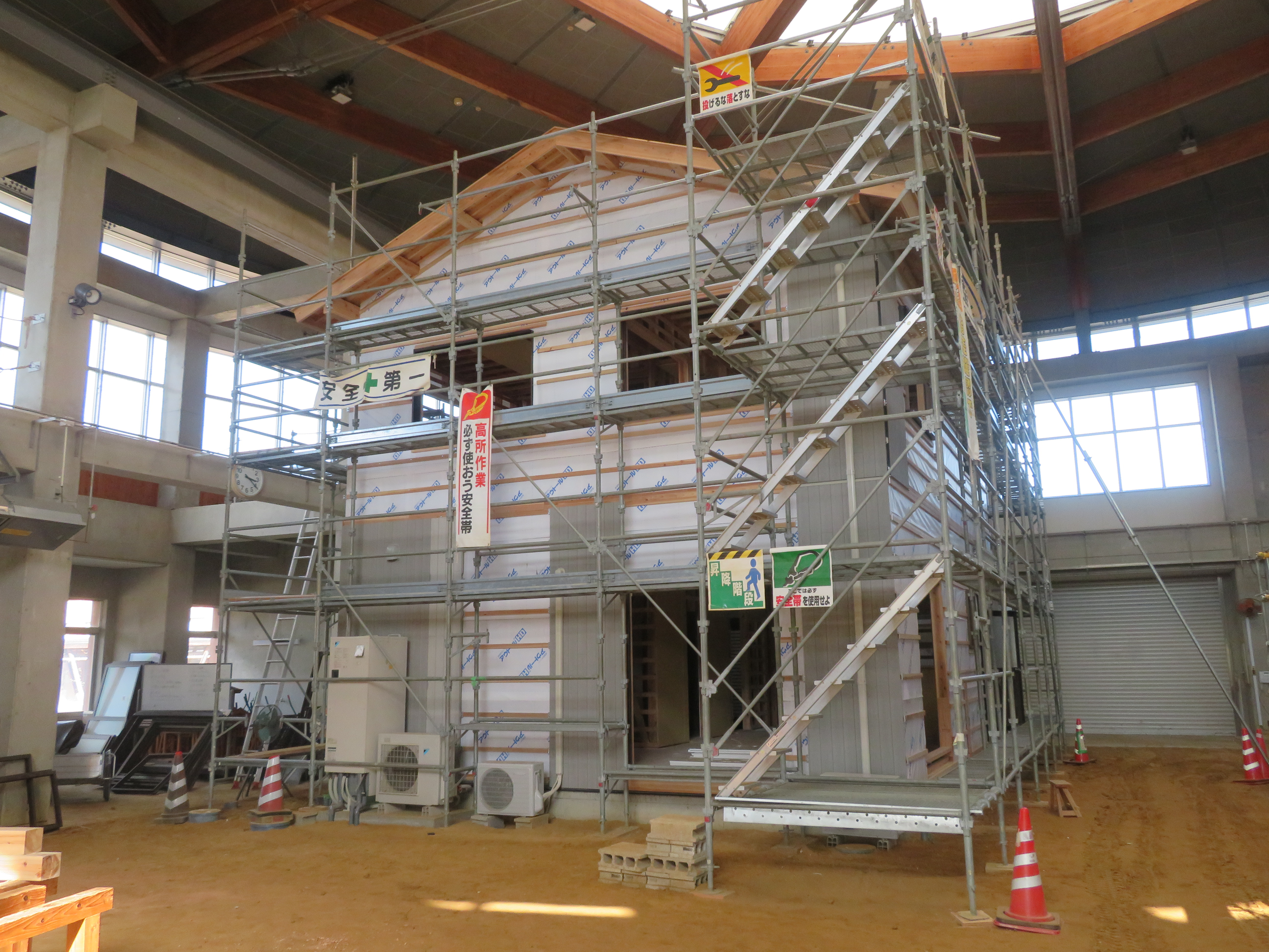 県立産業技術専門校では、施工実習で建築した木造住宅(骨組のみ、1棟)と木造倉庫(骨組のみ、4棟)を販売します。